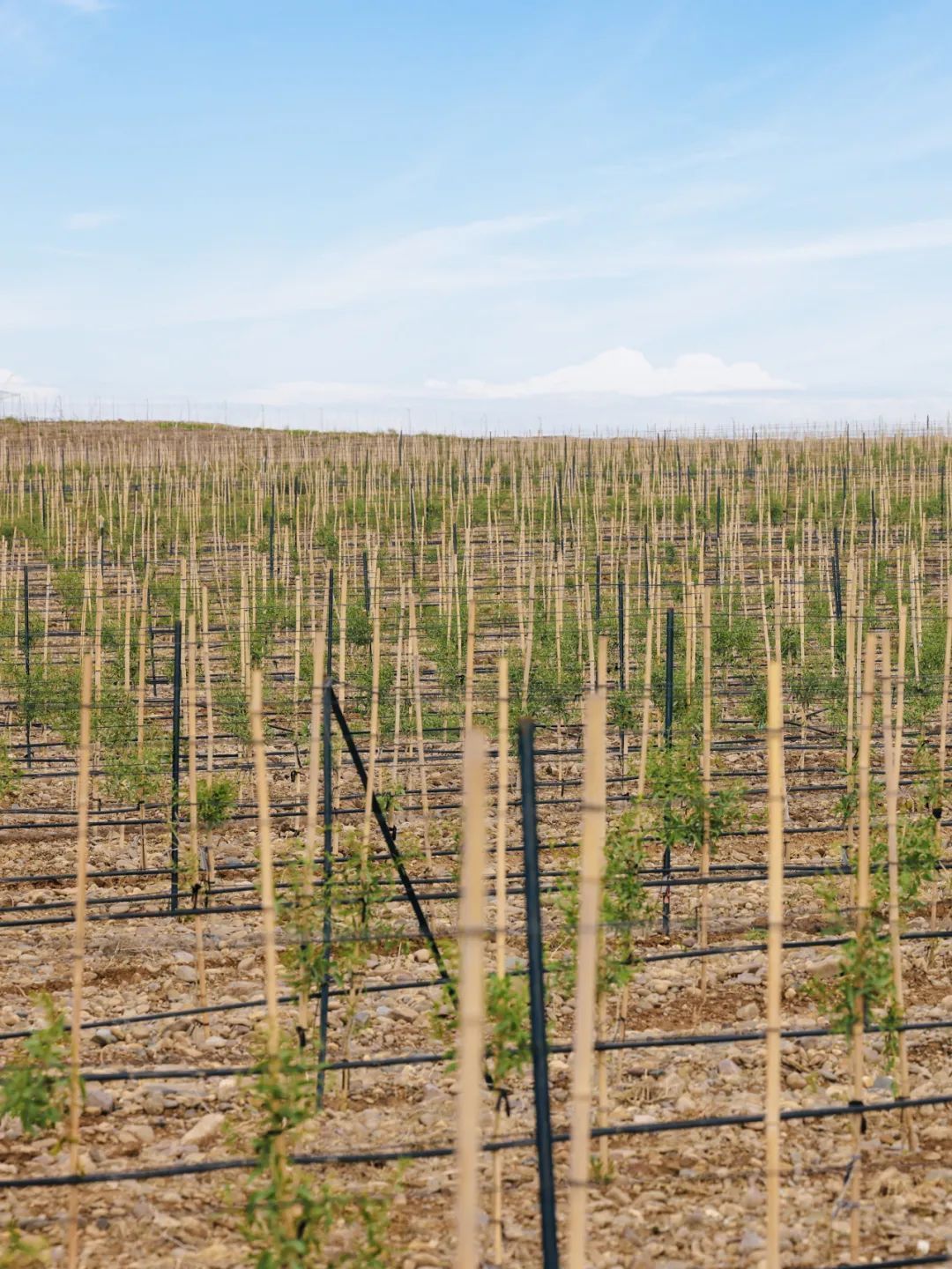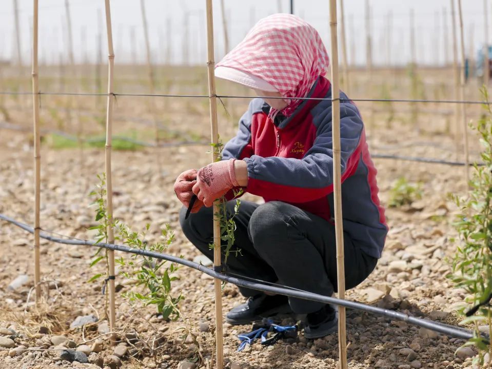 在到达中卫市的第二天,我们走访了中宁县的“绿带行动”枸杞种植地,当地农业合作社负责人田师傅、贺大姐们正在对枸杞的幼苗进行固定捆绑。