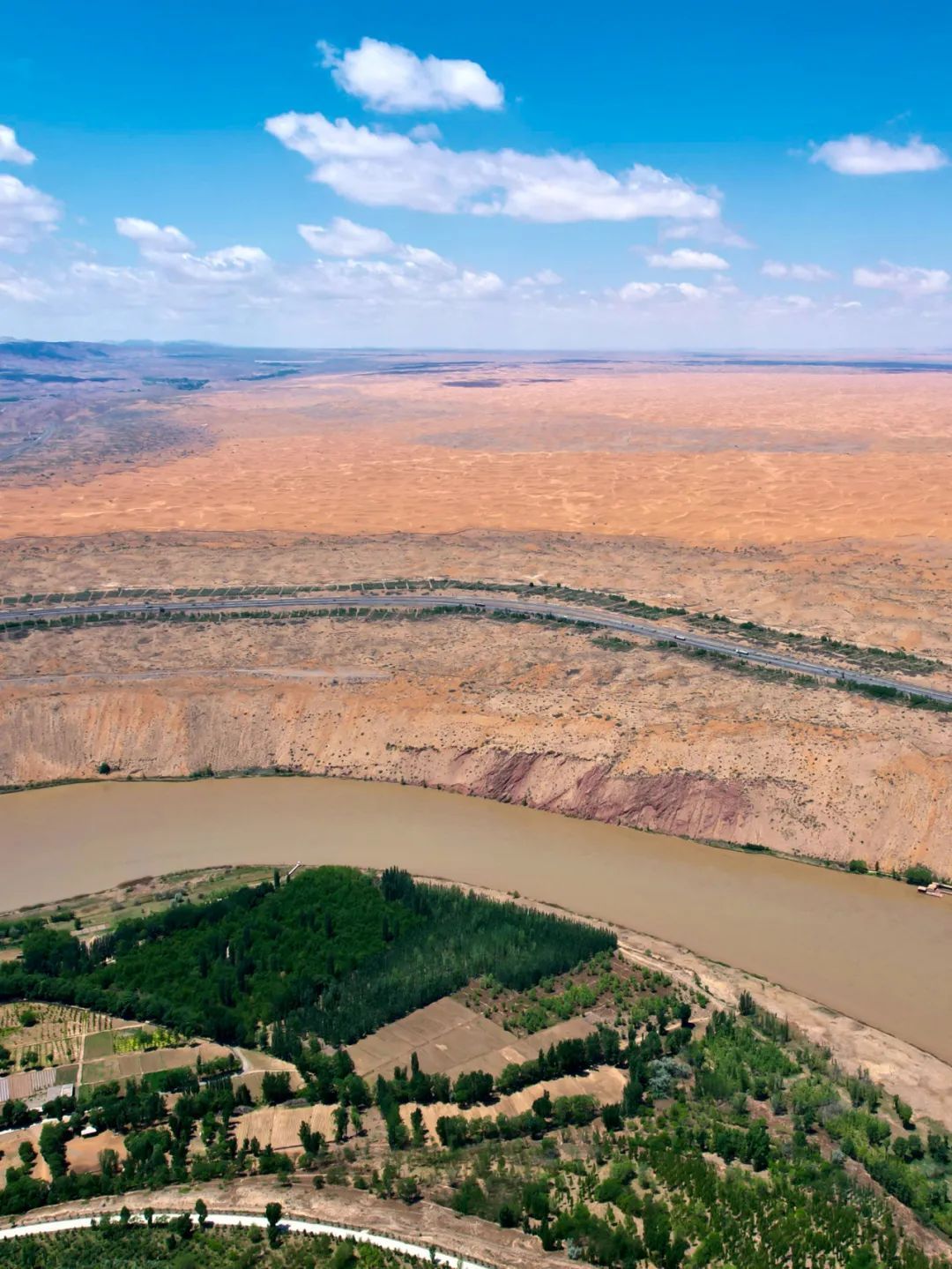 腾格里沙漠、包兰铁路、338国道、黄河同框▼