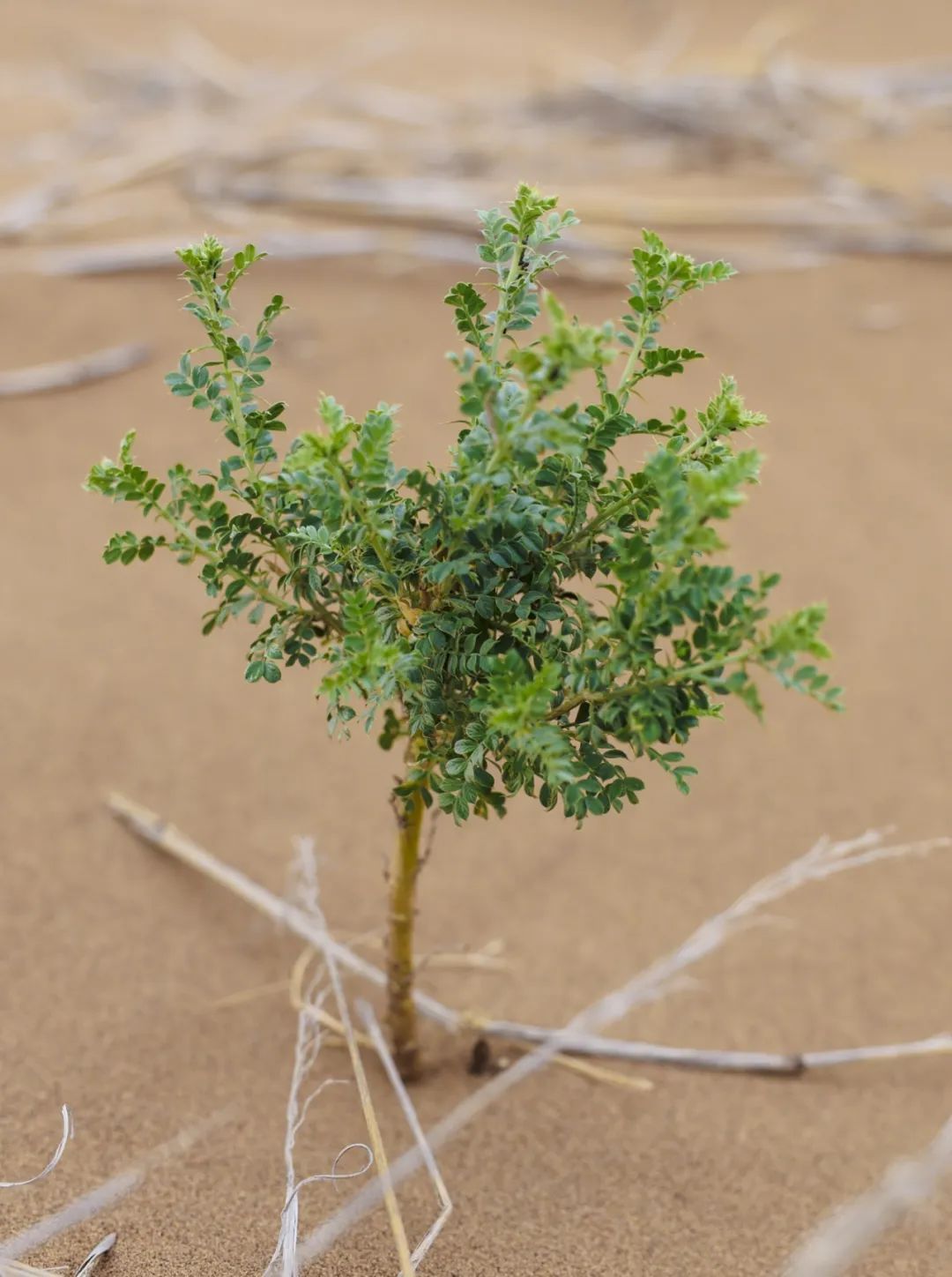 鉴于沙漠极低的环境承载力,直接种杨柳松柏这些乔木反而会耗尽水源,一般先种梭梭树、柠条、花棒这些生命力顽强的灌木,它们在草方格、人工滴灌的加持下,可以在沙地上长期存活,并逐渐把流动沙丘变为固定沙地,环境改善了,就可以种一些耐旱乔木。